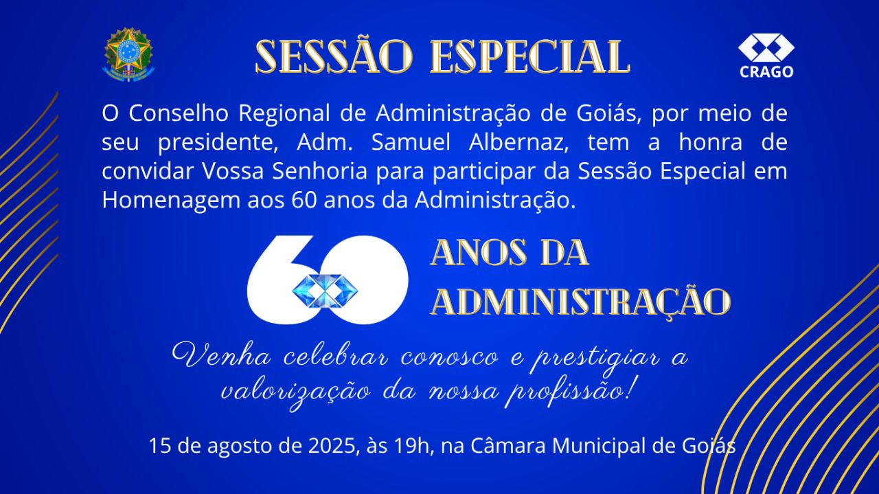 Nesta sexta-feira, 15 de agosto, às 19h, acontece na Câmara Municipal da cidade de Goiás, sessão especial em comemoração ao Jubileu de Diamante da Administração no Brasil.