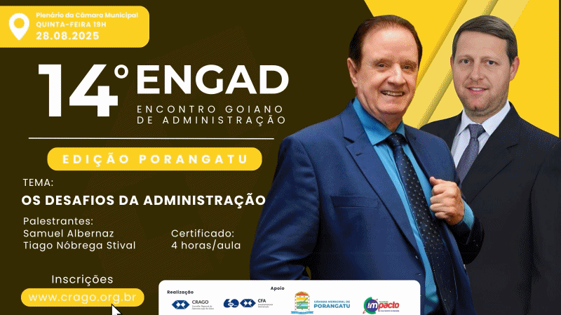 O Conselho Regional de Administração de Goiás realizará a 14ª edição do ENGAD - edição Porangatu, bem como prestará homenagens aos profissionais que contribuíram para a valorização da classe."