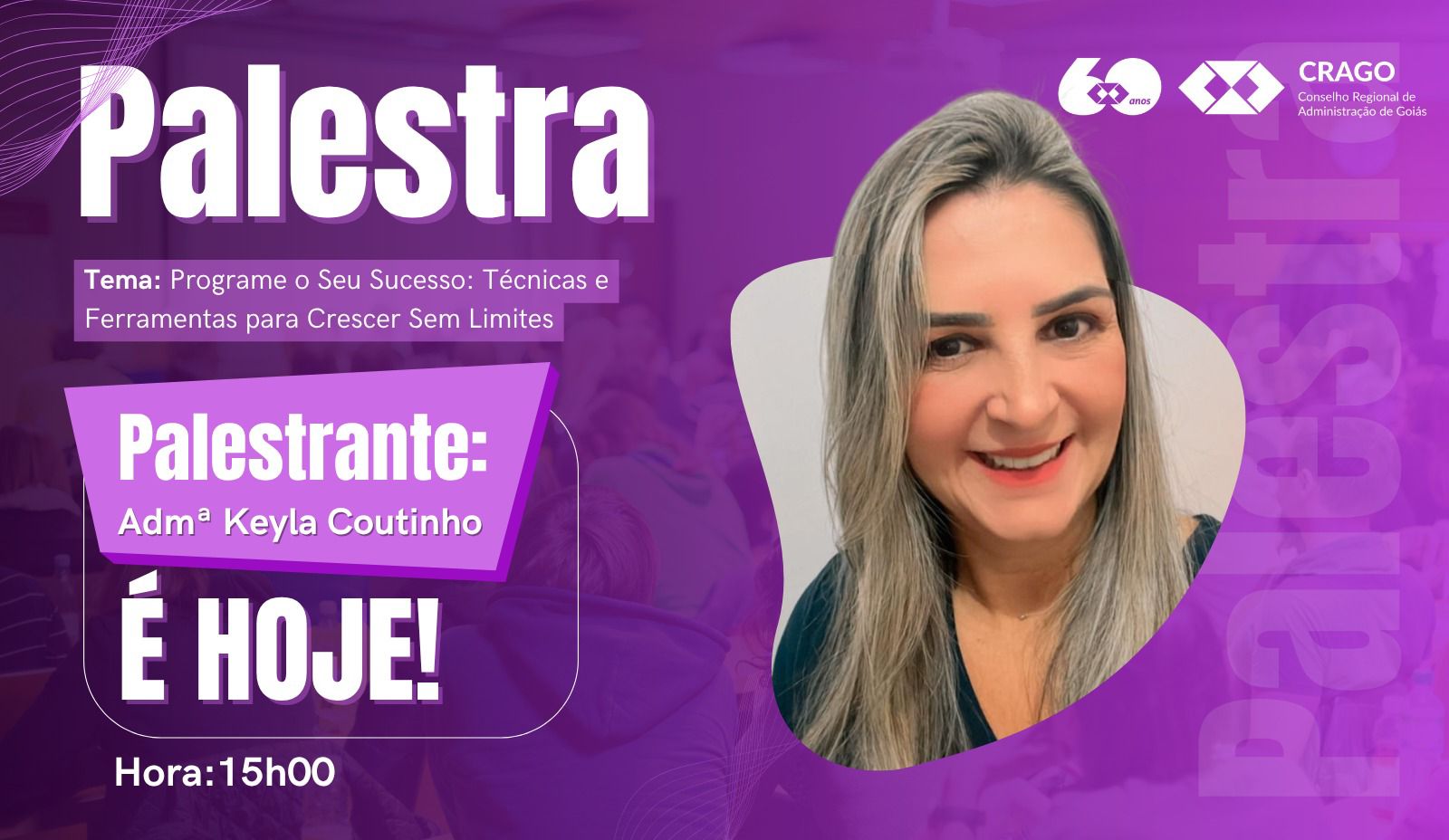 O Conselho Regional de Administração de Goiás, promove nesta sexta-feira, às 15h, palestra on-line, com o tema "Programe o Seu Sucesso: Técnicas e Ferramentas para Crescer Sem Limites" e será apresentada pela administradora Keyla Coutinho.