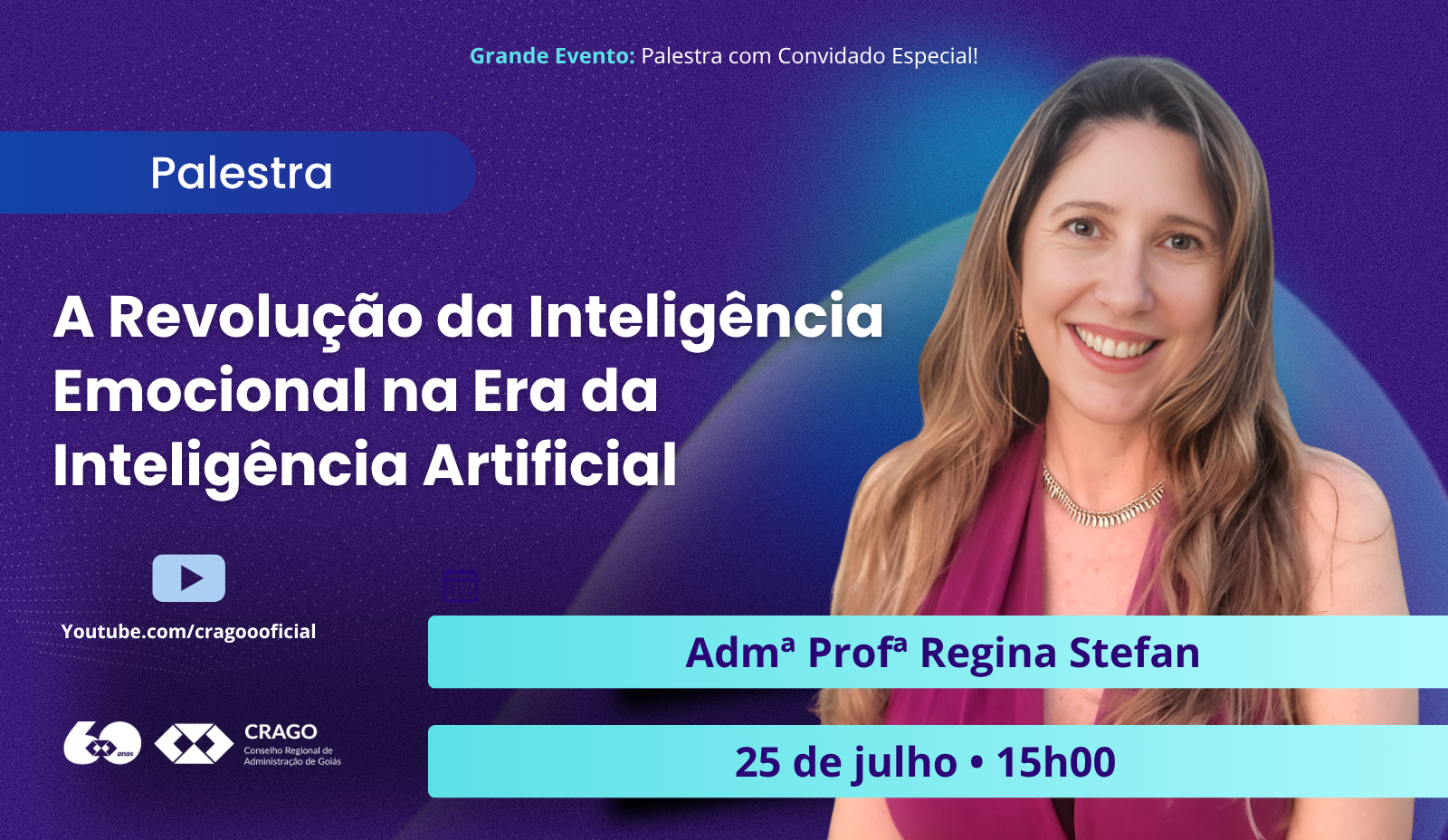 O Conselho Regional de Administração de Goiás (CRAGO) realiza no dia 25 de julho, às 15h, palestra com o tema: “A Revolução da Inteligência Emocional na Era da Inteligência Artificial, com a administradora Regina Stefan.
