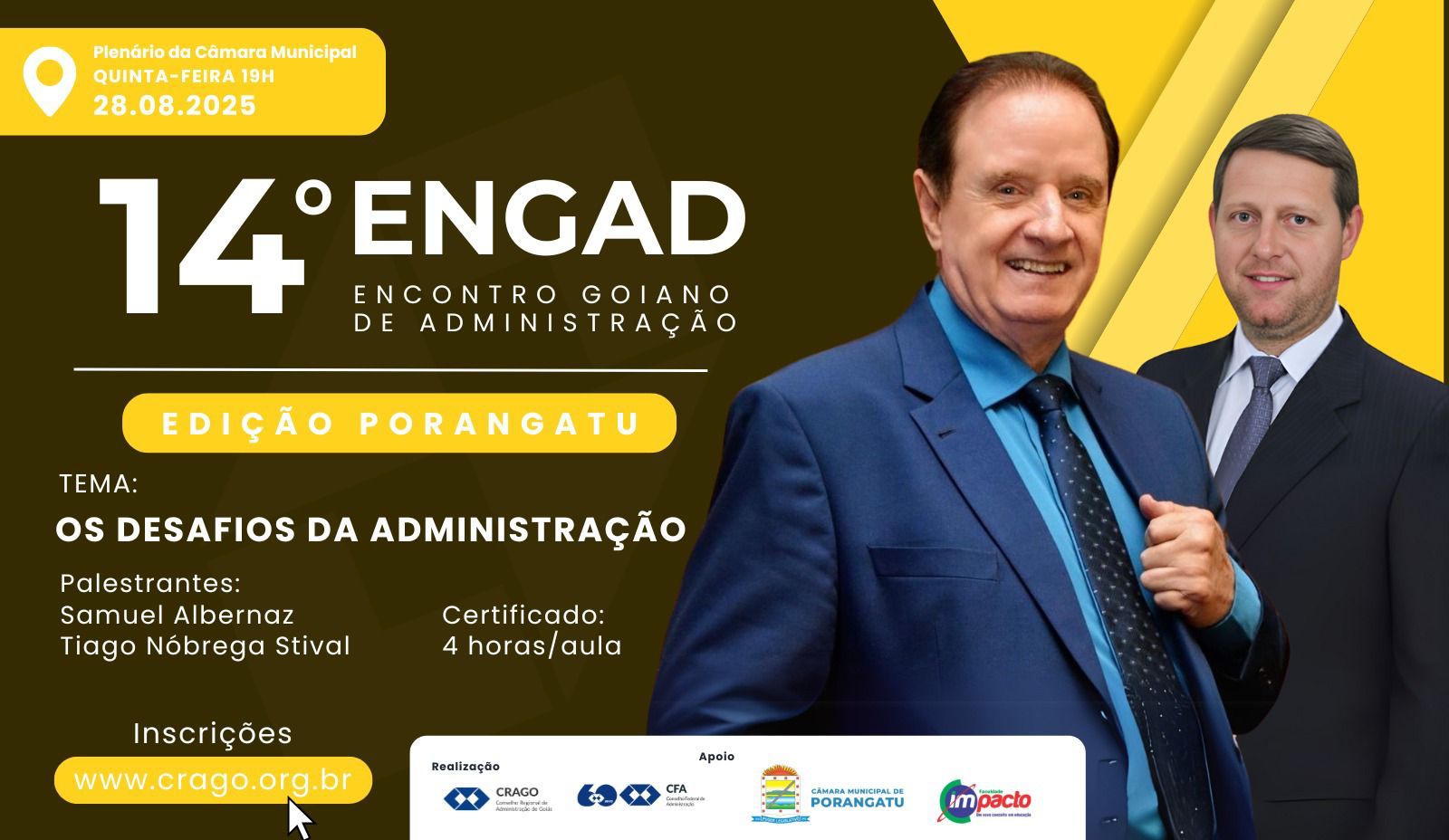 O evento acontecerá no Plenário da Câmara Municipal de Porangatu e contará com as presenças ilustres do presidente do CRAGO, Adm. Samuel Albernaz e do conselheiro federal, Adm. Tiago Nóbrega Stival, que abordarão o tema “Os Desafios da Administração”.