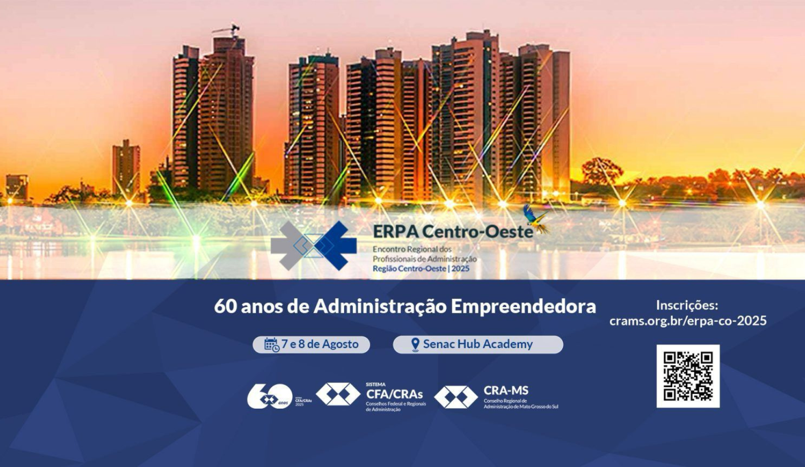 Promovido pelos CRAs de Mato Grosso do Sul, Goiás, Distrito Federal e Mato Grosso, com apoio do Conselho Federal de Administração (CFA), o ERPA Centro-Oeste 2025 tem como tema central “60 anos de Administração Empreendedora".